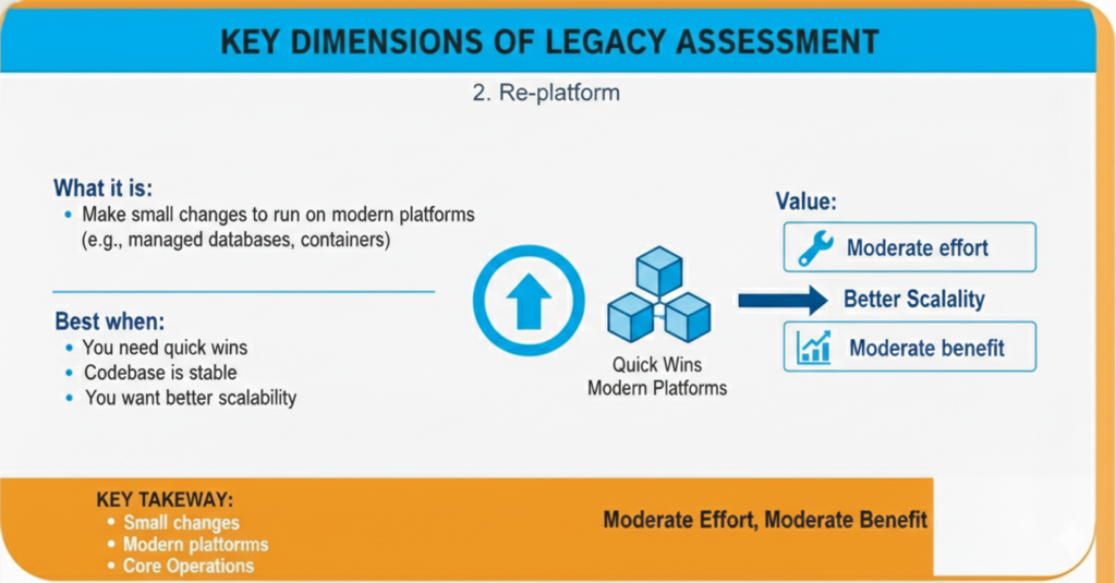 Make small changes to run on modern platforms (e.g., managed databases, containers).