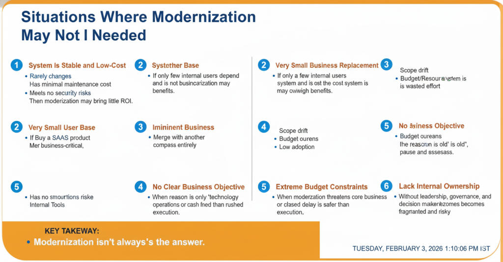 If only a few internal users depend on the system and it is not business‑critical, the cost of modernization may outweigh benefits.