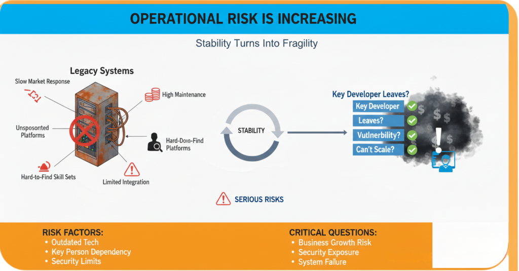 Legacy systems often appear stable, but beneath the surface they create: